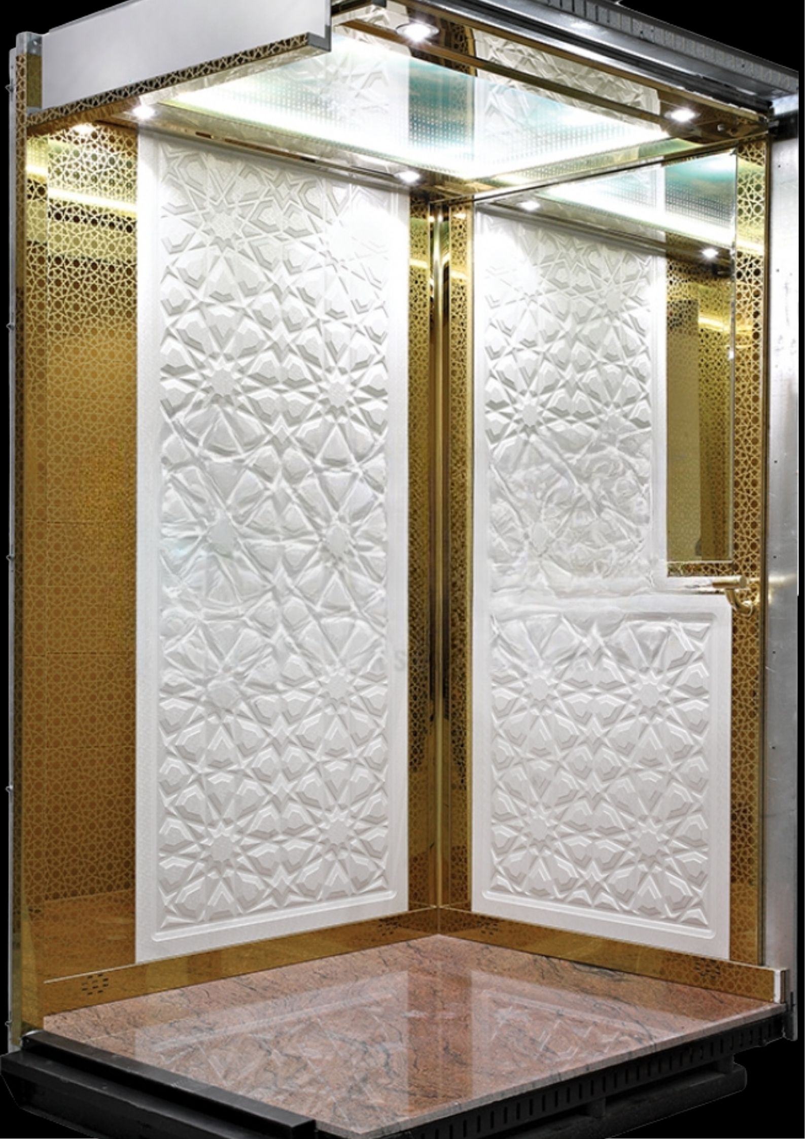 Asansör kabini arka duvarında ise şıklığı yansıtması düşünülerek boy ayna kullanıldı. Kabin tavanı, lazer kesim olup yıldızlı bir şekil tercih edildi (İstenilen modele göre tavan kesimi yapılmaktadır). Kabin tabanı ise tamamlayıcı olarak siyah mermer seçildi.