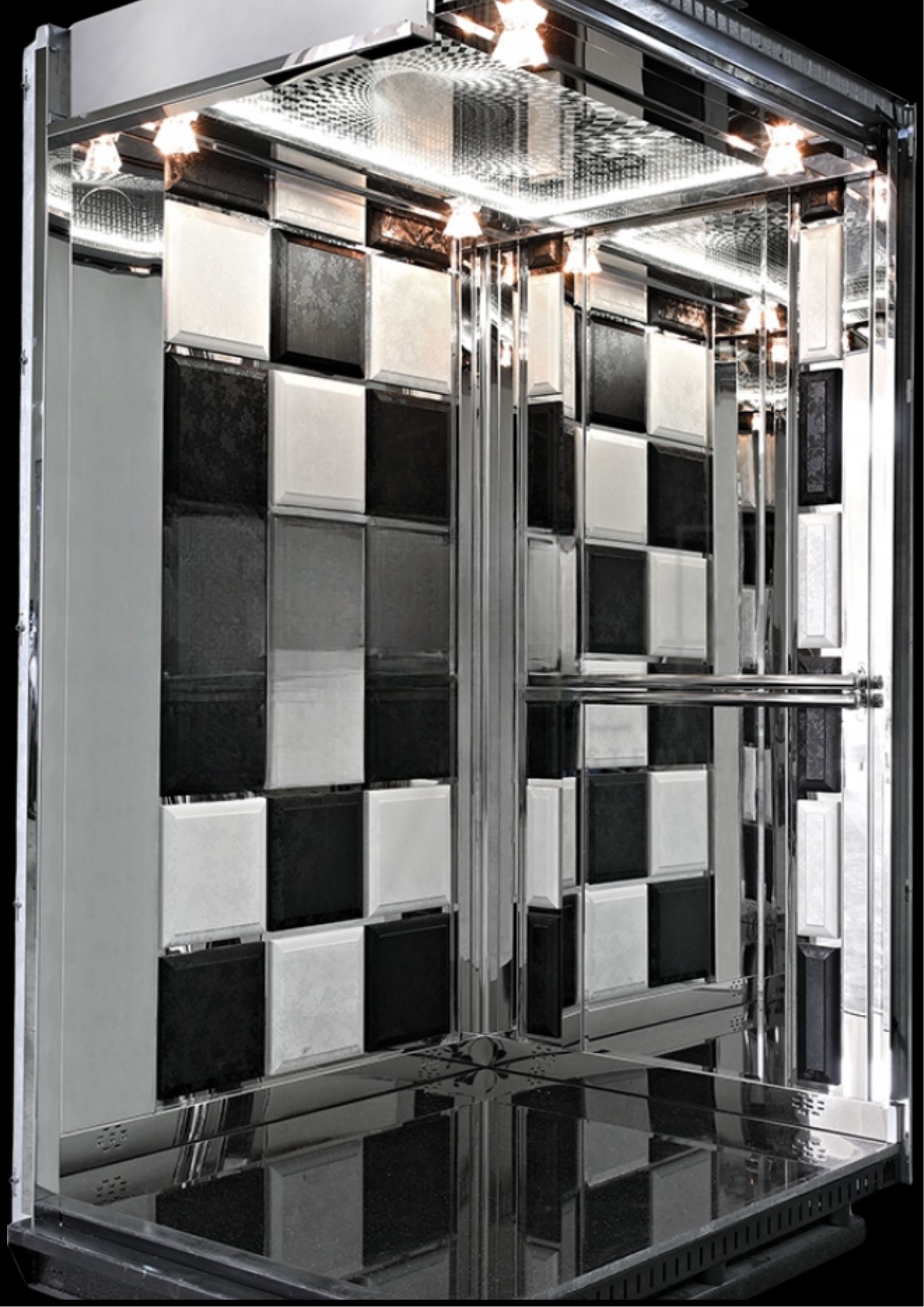 Şık, zarif ve gösterişli olması için tasarlandı. Her ne kadar sade bir tasarıma sahip olsa da fazlasıyla gösterişli olan KMS -16 asansör kabini yan duvarları gösterişli siyah, altın sarısına sahip dekoratif camlarla bezendi.